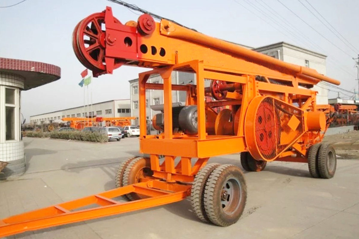 3. Percussion drilling rig is very popular in the market currently, all of its components are all installed in the trailer, like electric motor, hoist, mast etc, integrate motion. The percussion drilling rig uses the crank-link mechanism to change the power's gyration motion into alternating motion, through the steel cable to drive the drill bit to do up-and-down motion.