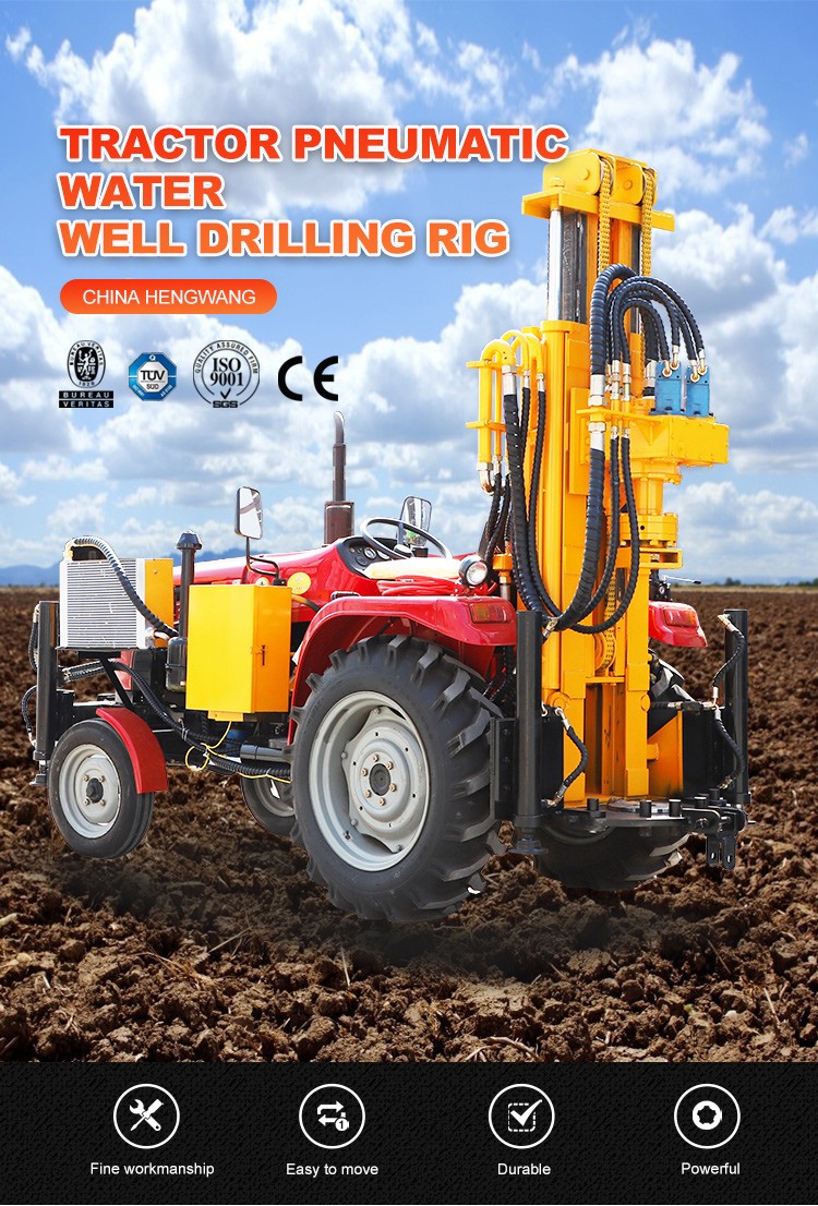 Heng wang water well drilling rig is an integrated drilling equipment by combining tractor and pneumatic water well drilling rig, which is easy to walk and combined the air compressor.