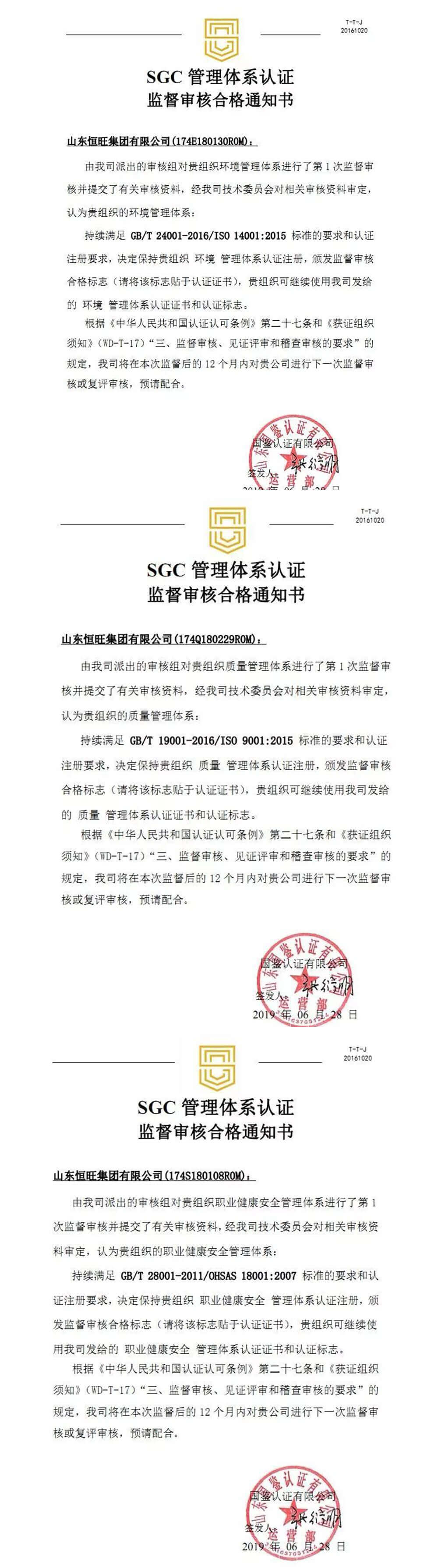 The adoption of the supervision and certification of the three systems of our group will further improve the management system of the Group, standardize and standardize all work, promote continuous improvement of various tasks, and further promote the management of the Group to a new level.
