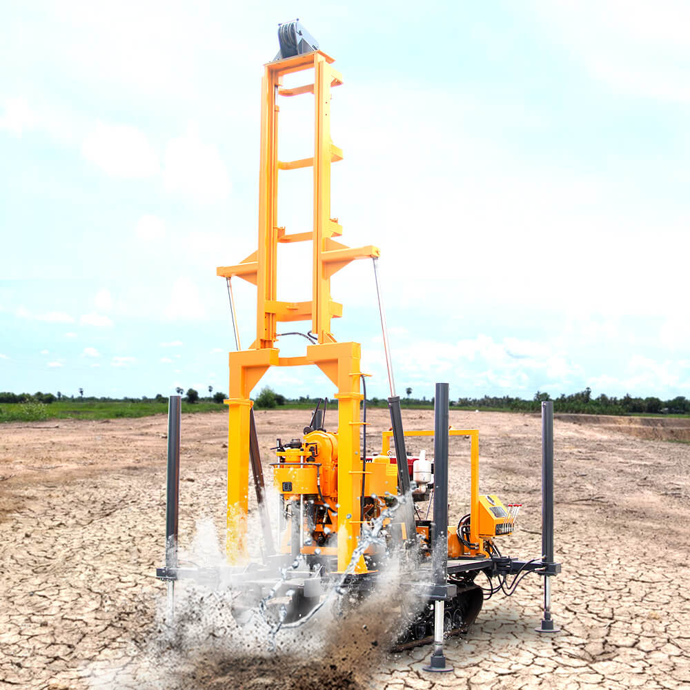 The crawler of the water well drilling rig is composed of a crawler shoe and a crawler pin. The track pins connect the track shoes to form a track chain link. There are holes at both ends of the track shoe, which mesh with the driving wheel, and there are induced teeth in the middle, which are used to correct the track and prevent the track from falling off when the water well drill is turning. There are reinforced anti-skid ribs (referred to as pattern) on the side that contacts the ground. Improve the firmness of the track shoe and the adhesion between the track and the ground. There are also supporting wheels, supporting wheels, driving wheels and rail links on the water well drilling rig site.